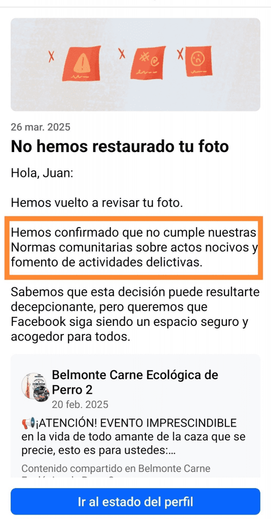 Papá Facebook dice que infringimos las normas comunitarias sobre actos nocivos y fomento de actividades delictivas. O sea, lobos sí pero perros no. El chiste se cuenta solo.